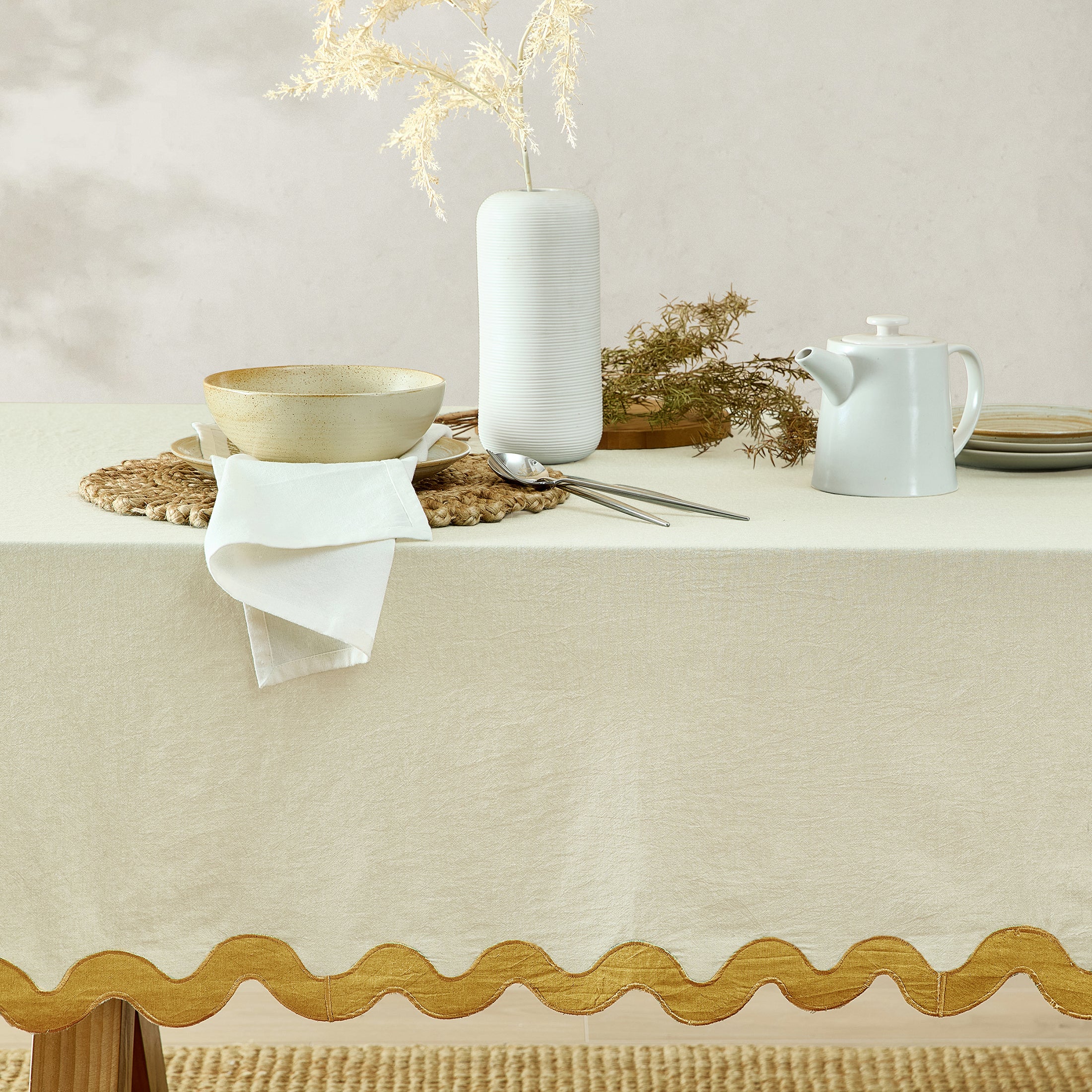Natural, soft, and effortlessly stylish for casual dinners or special occasions. A refined ruffle-edge tablecloth designed to elevate every setting. Crafted from stonewashed cotton, it drapes beautifully over any table, offering both comfort and sophistication.