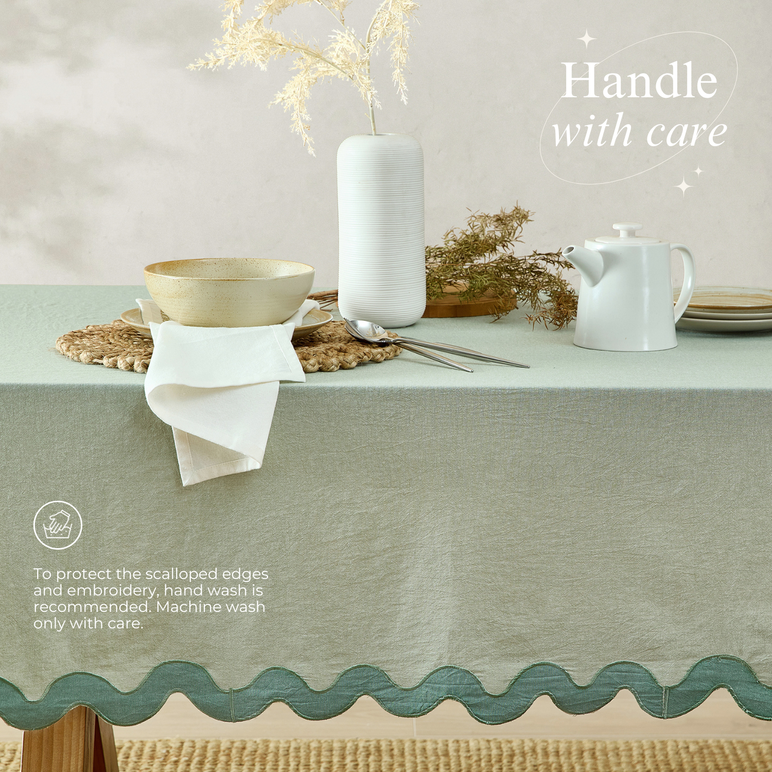 • stonewashed cotton tablecloth scalloped edge sage