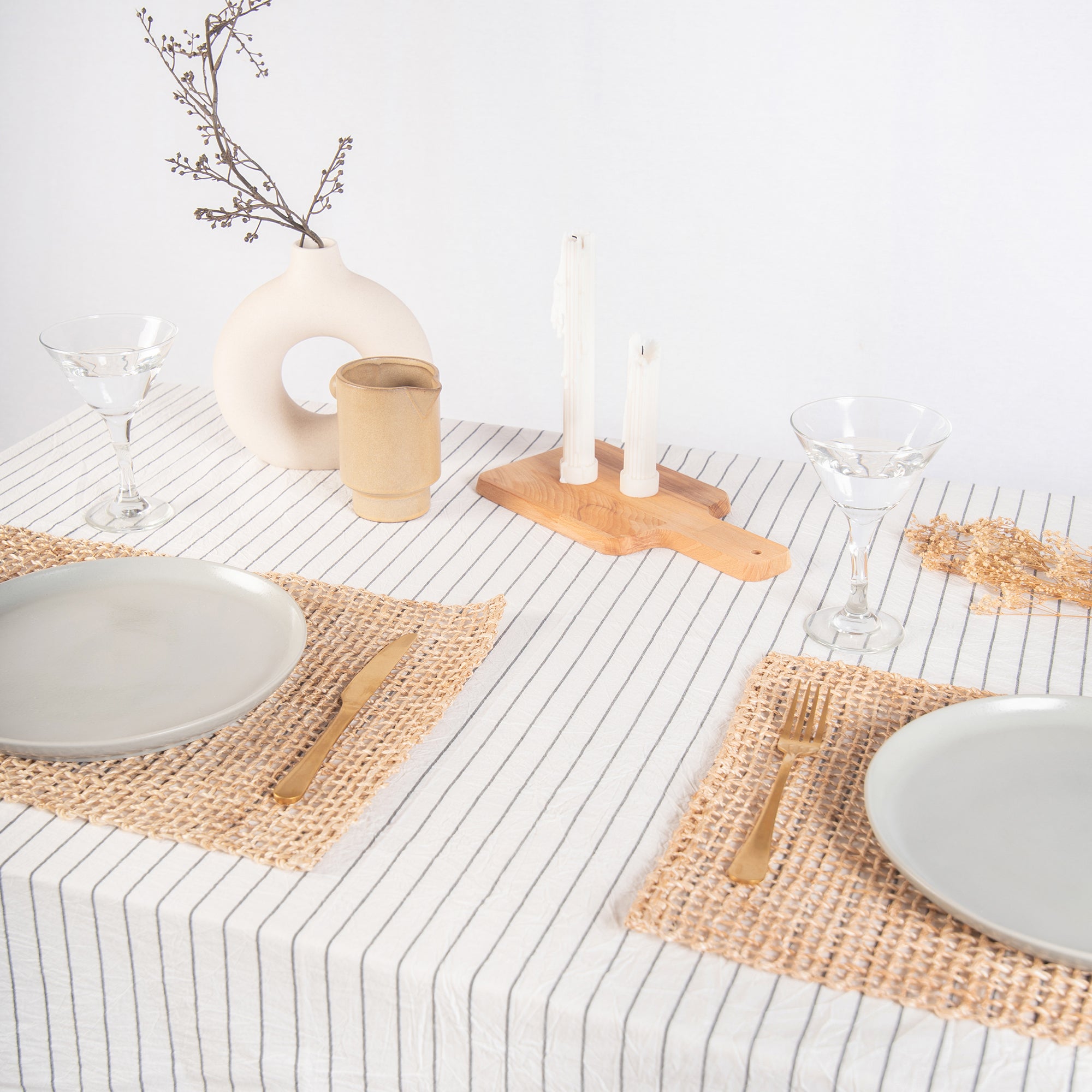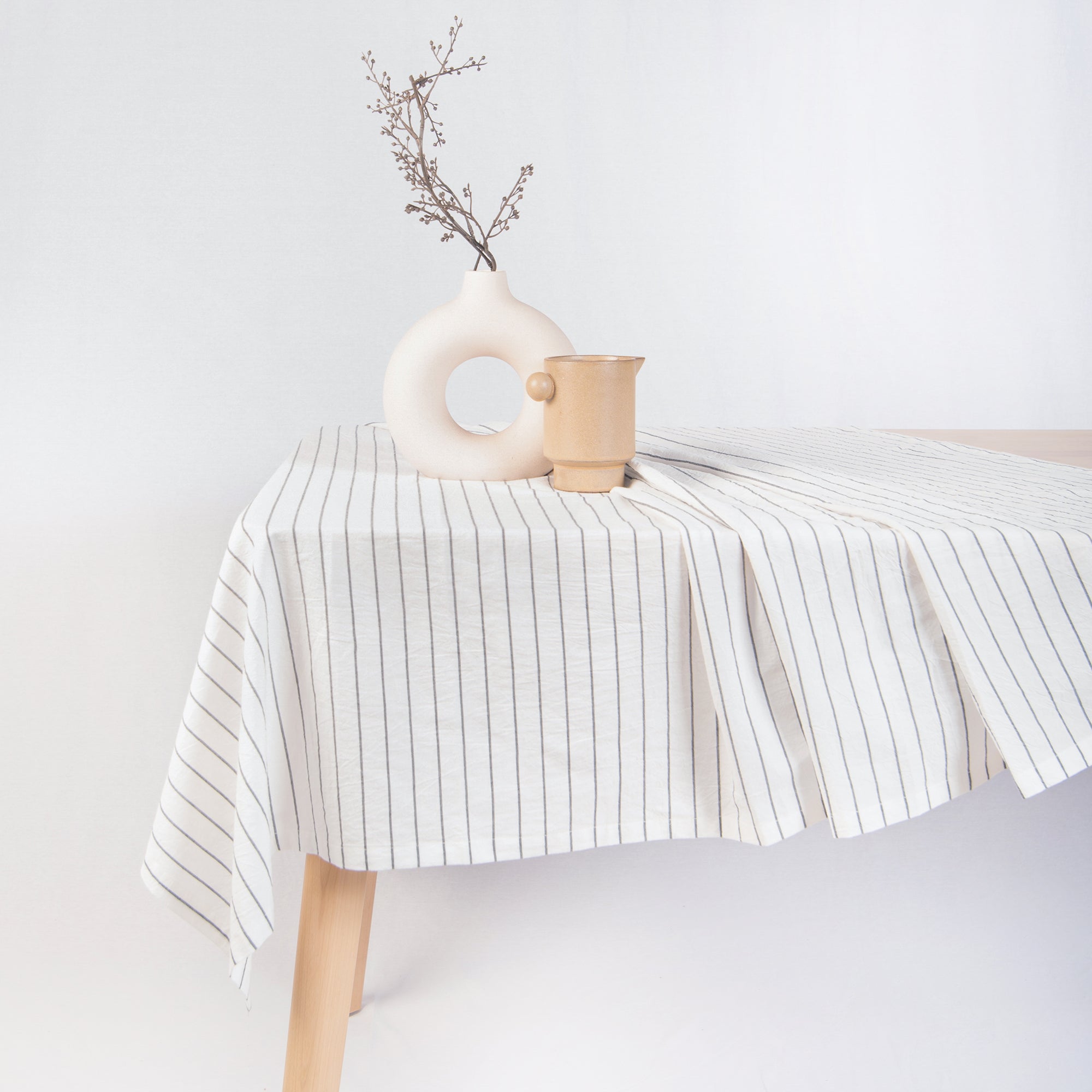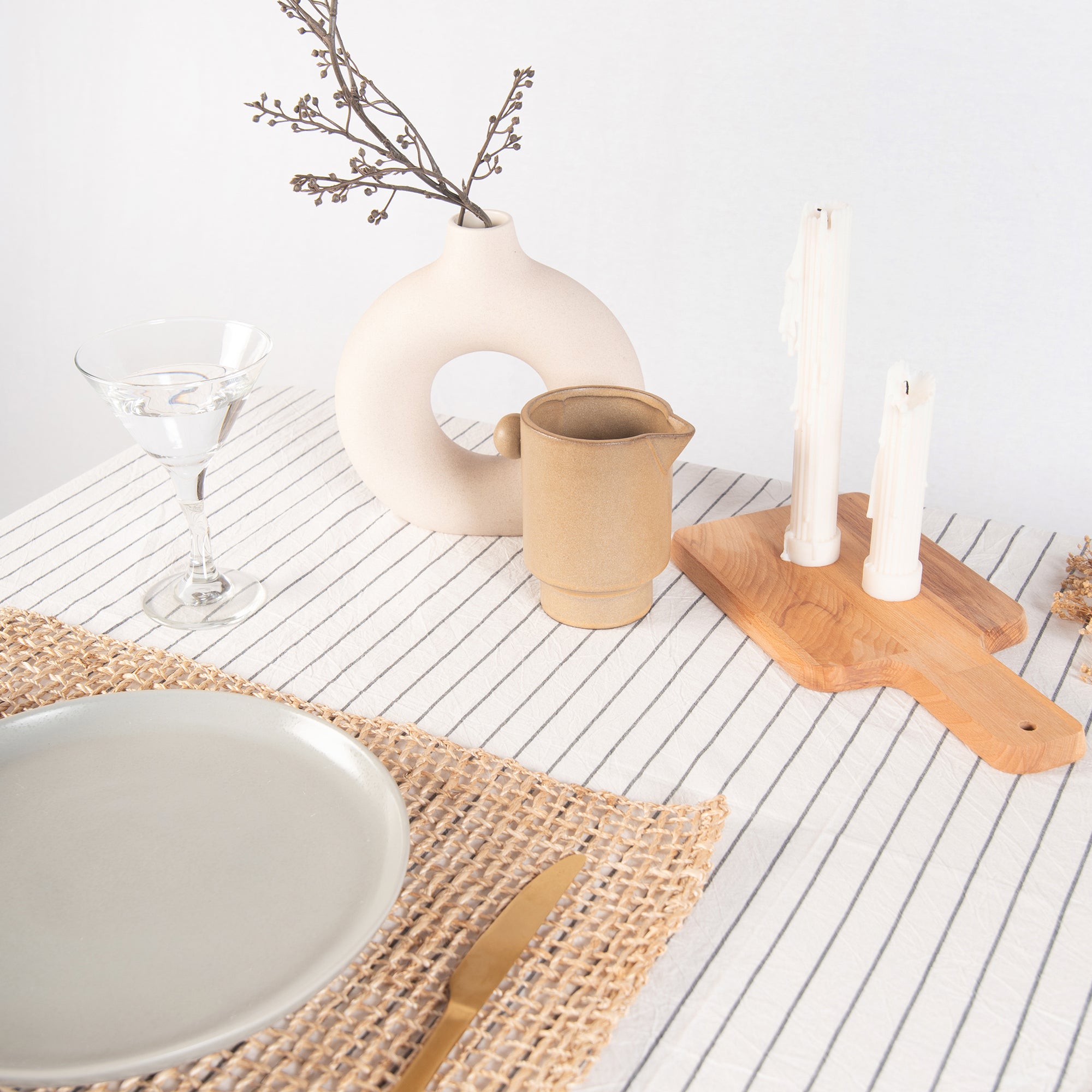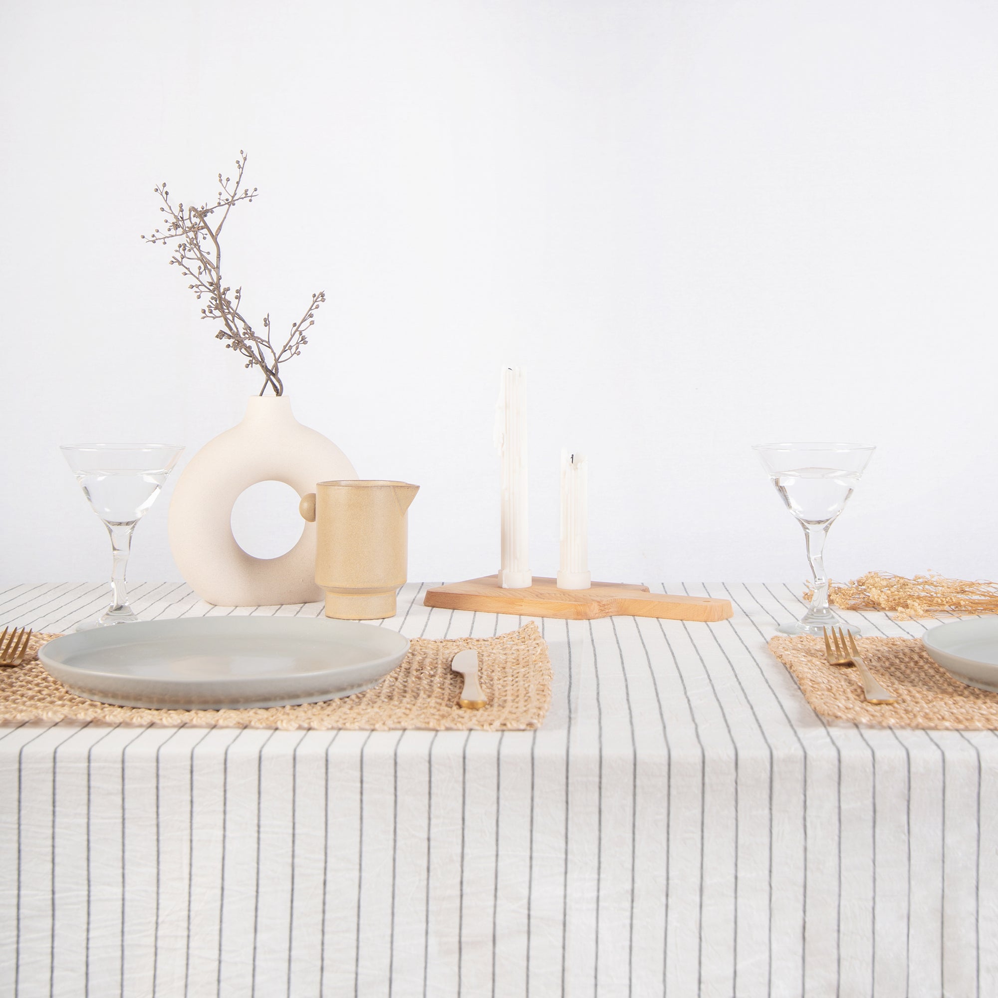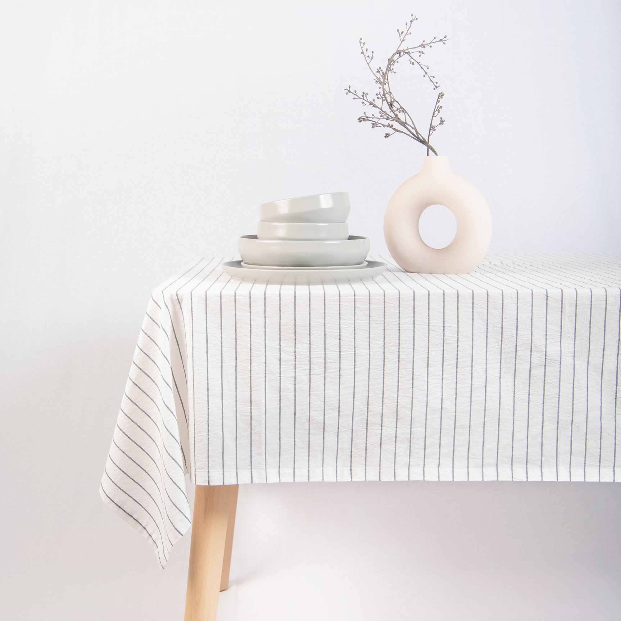 • Table with striped tablecloth, ceramic bowls, and vase on a plain background