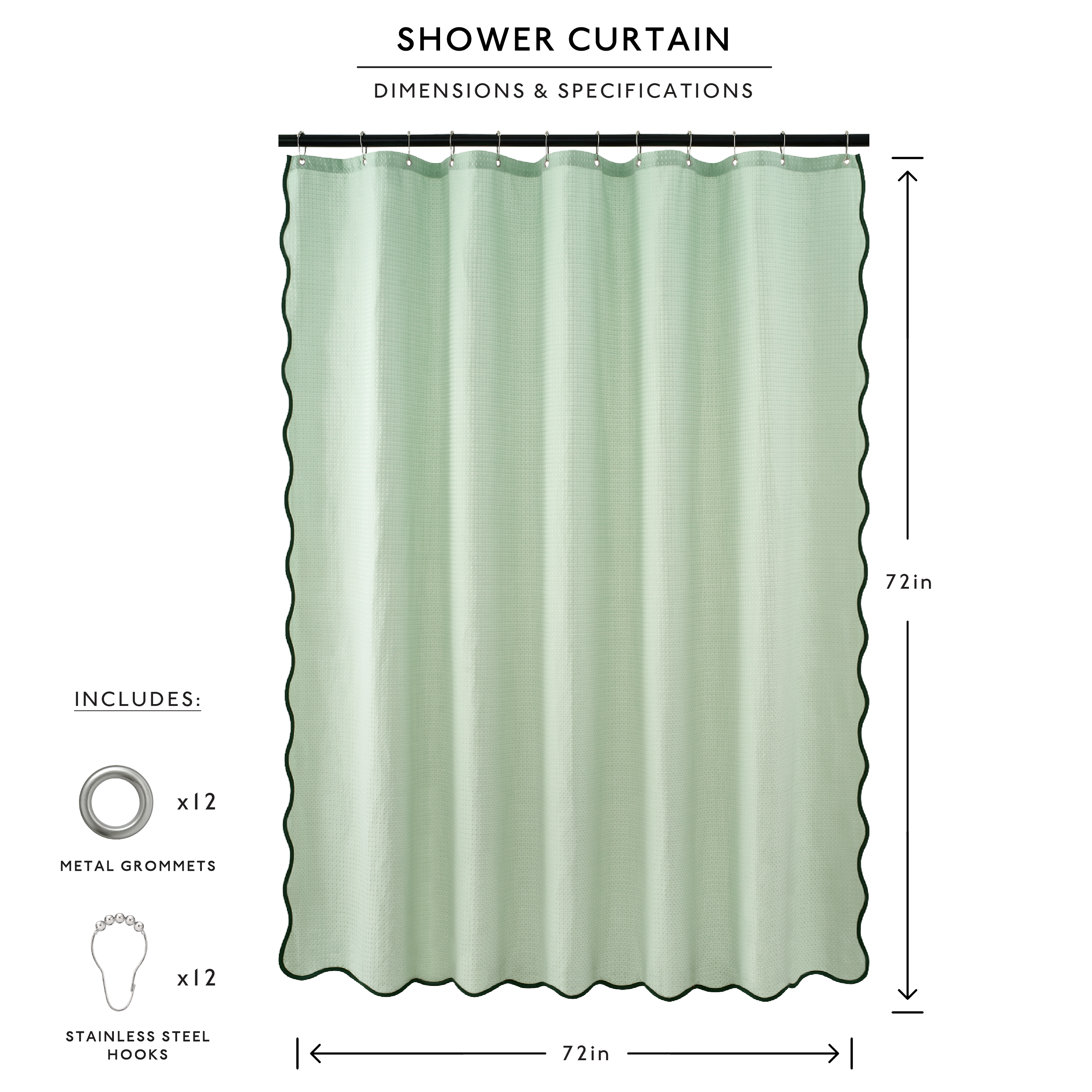SPECIFICATIONS: Includes (1) premium 100% polyester shower curtain with elegant metal grommet holes + (12) stainless steel hooks. Color may appear more or less saturated depending on drape and light in your space