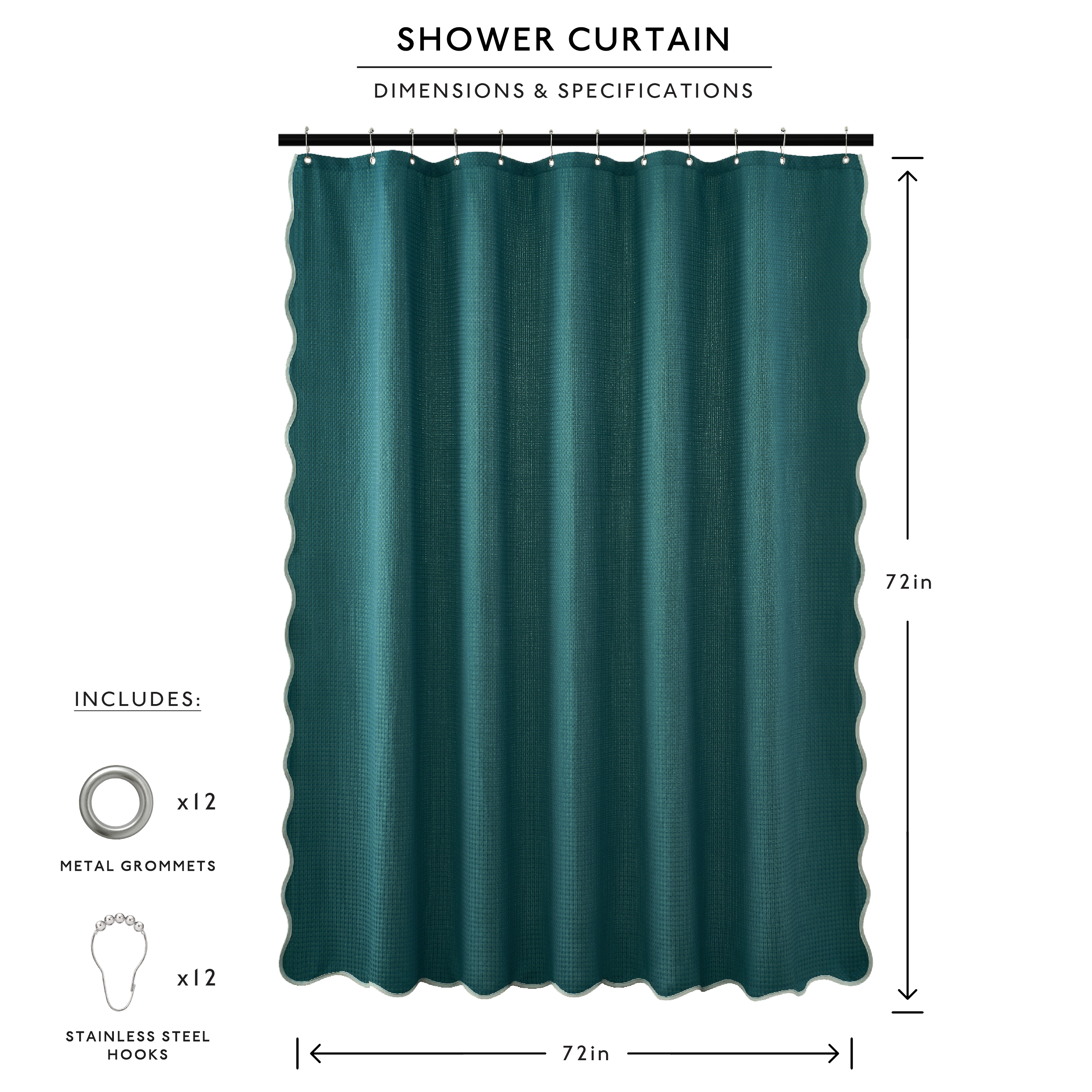 SPECIFICATIONS: Includes (1) premium 100% polyester shower curtain with elegant metal grommet holes + (12) stainless steel hooks. Color may appear more or less saturated depending on drape and light in your space