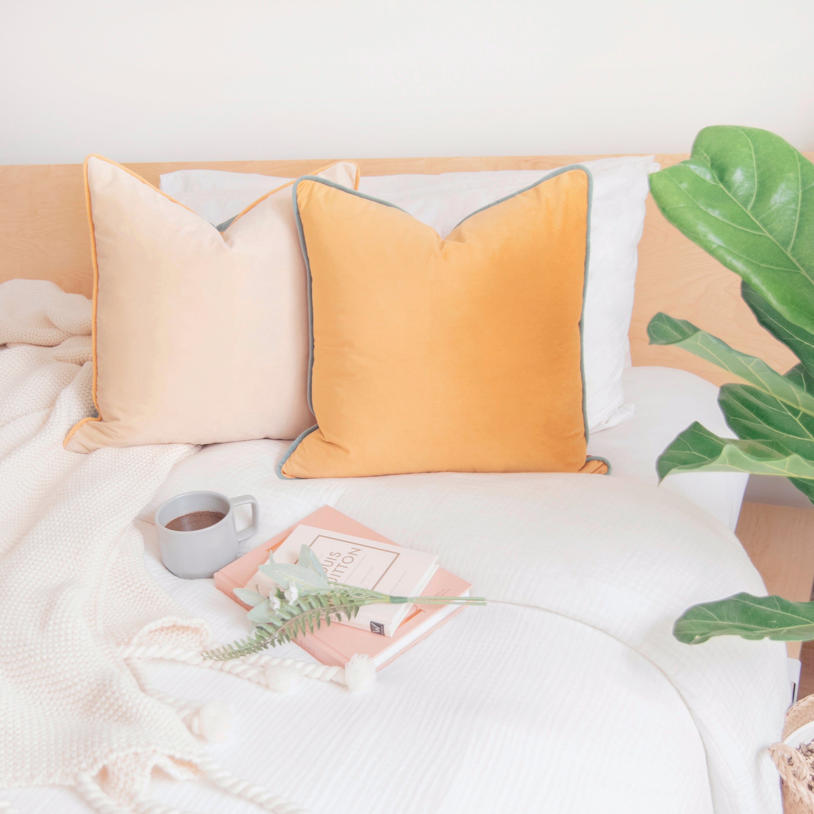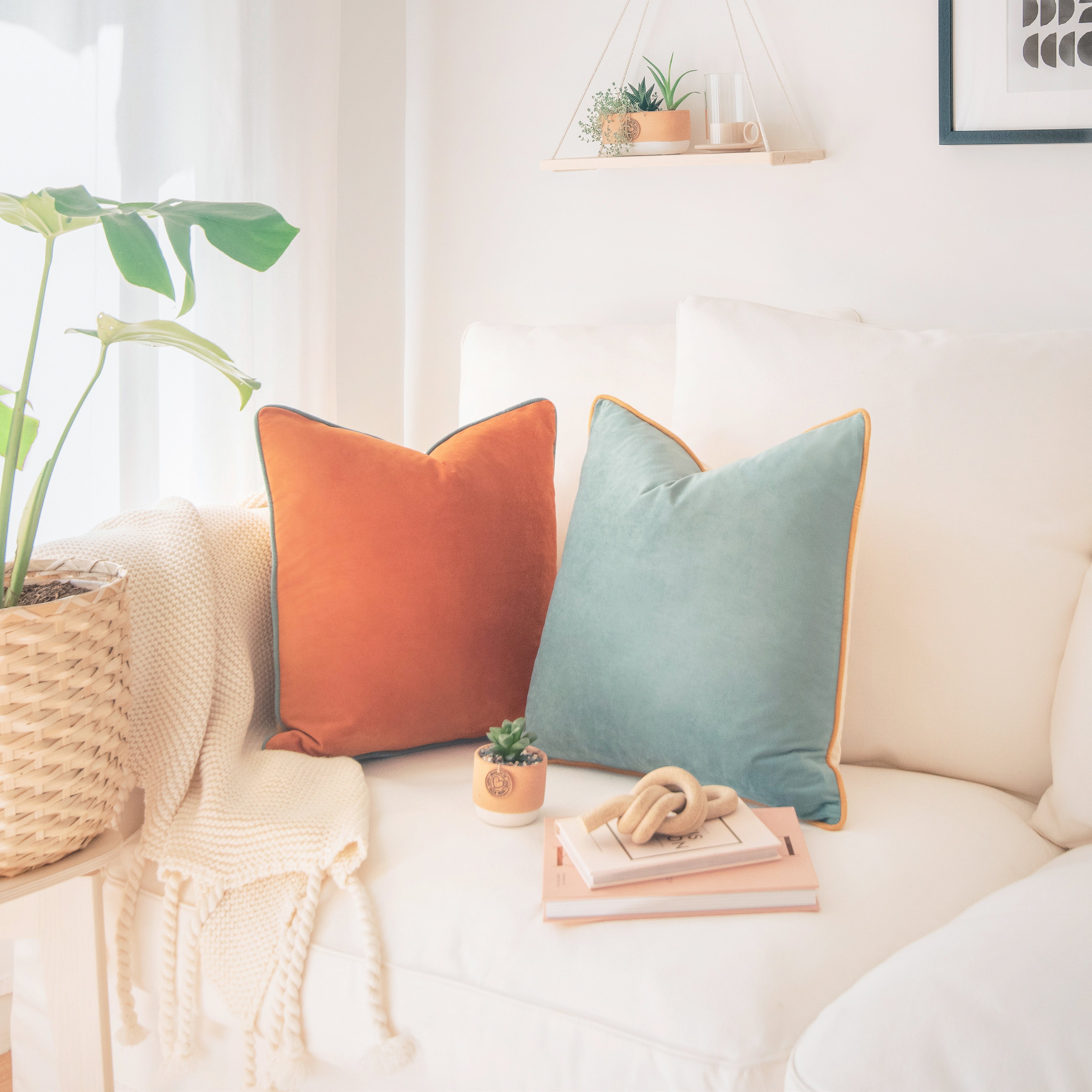 - SET OF 2: Includes 1 yellow/orange velvet pillow + 1 teal/beige velvet pillow