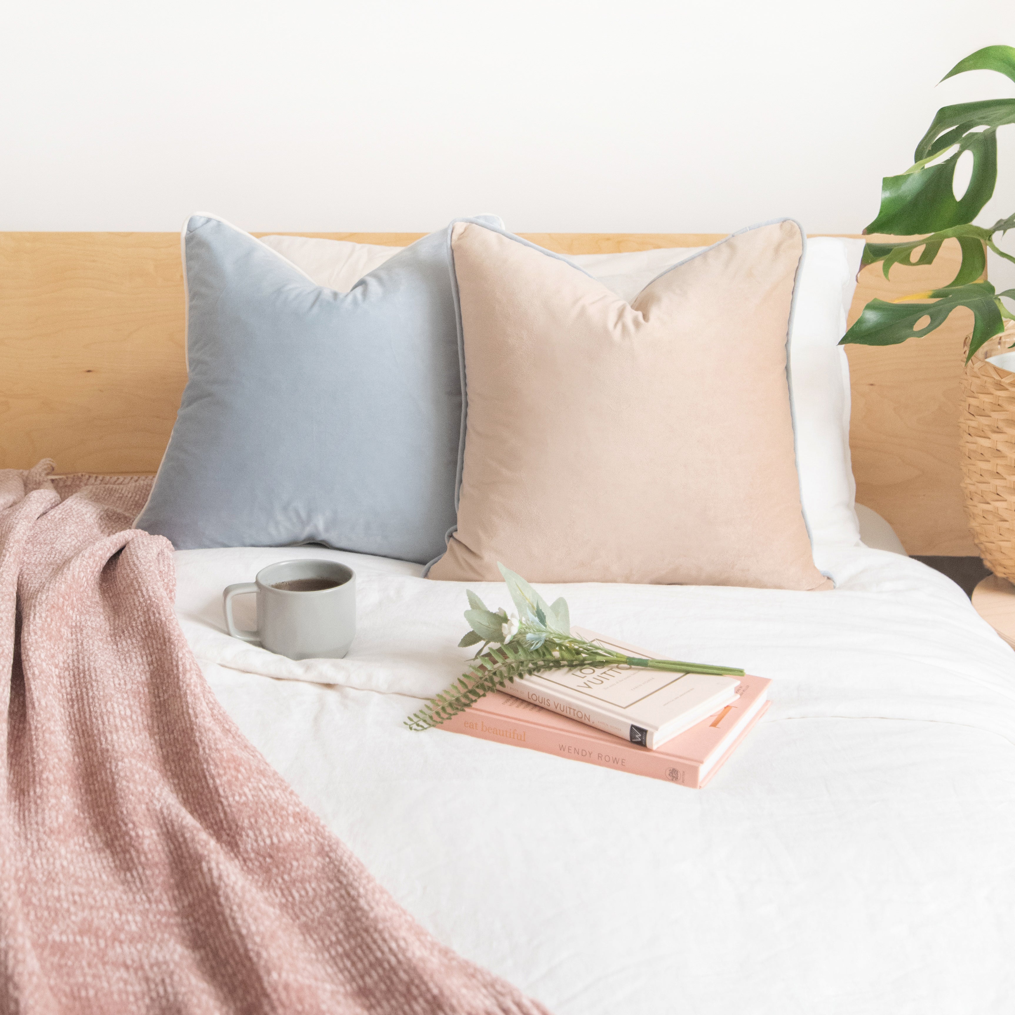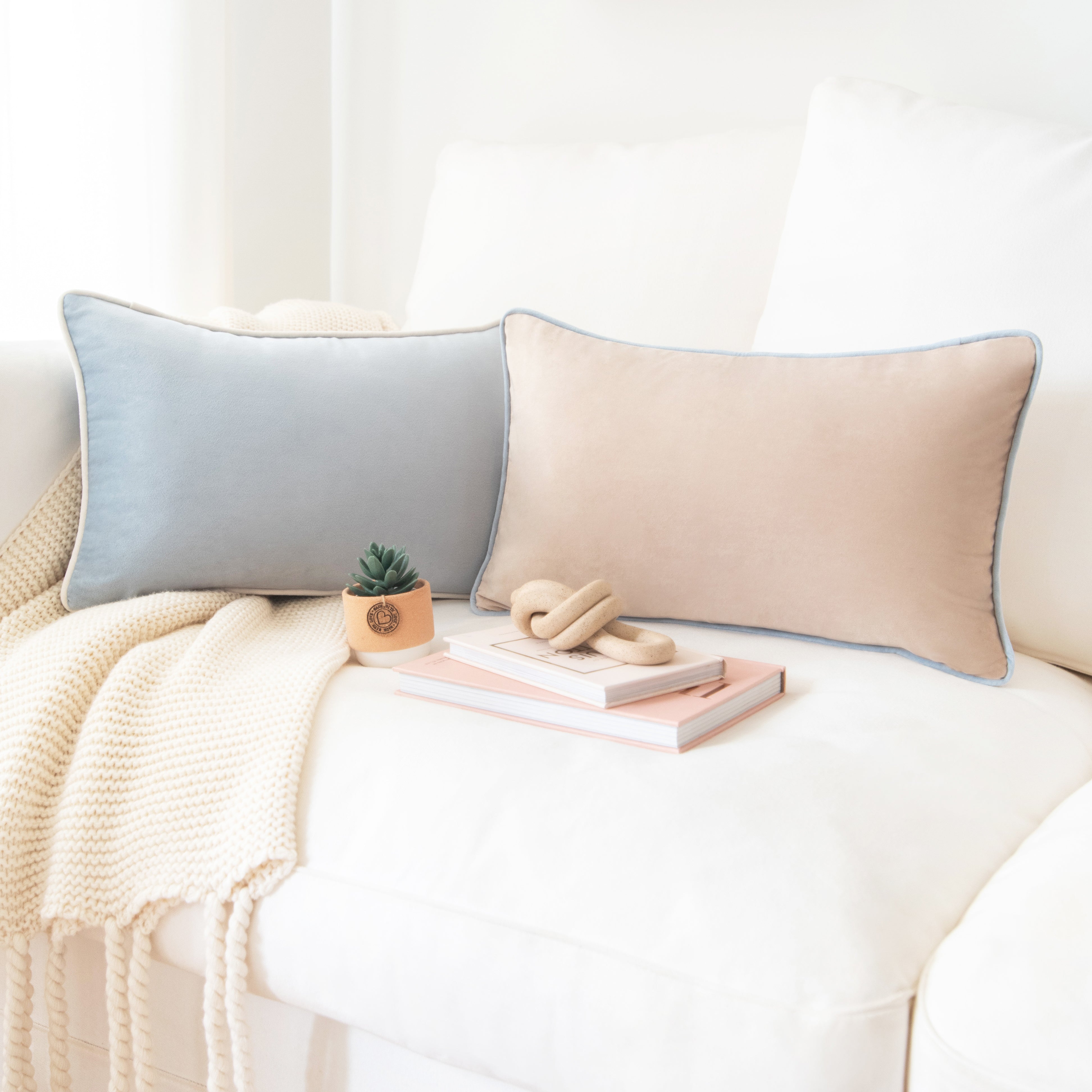 • SET OF 2: Includes 1 stone blue/cream velvet pillow + 1 beige/light blue velvet pillow