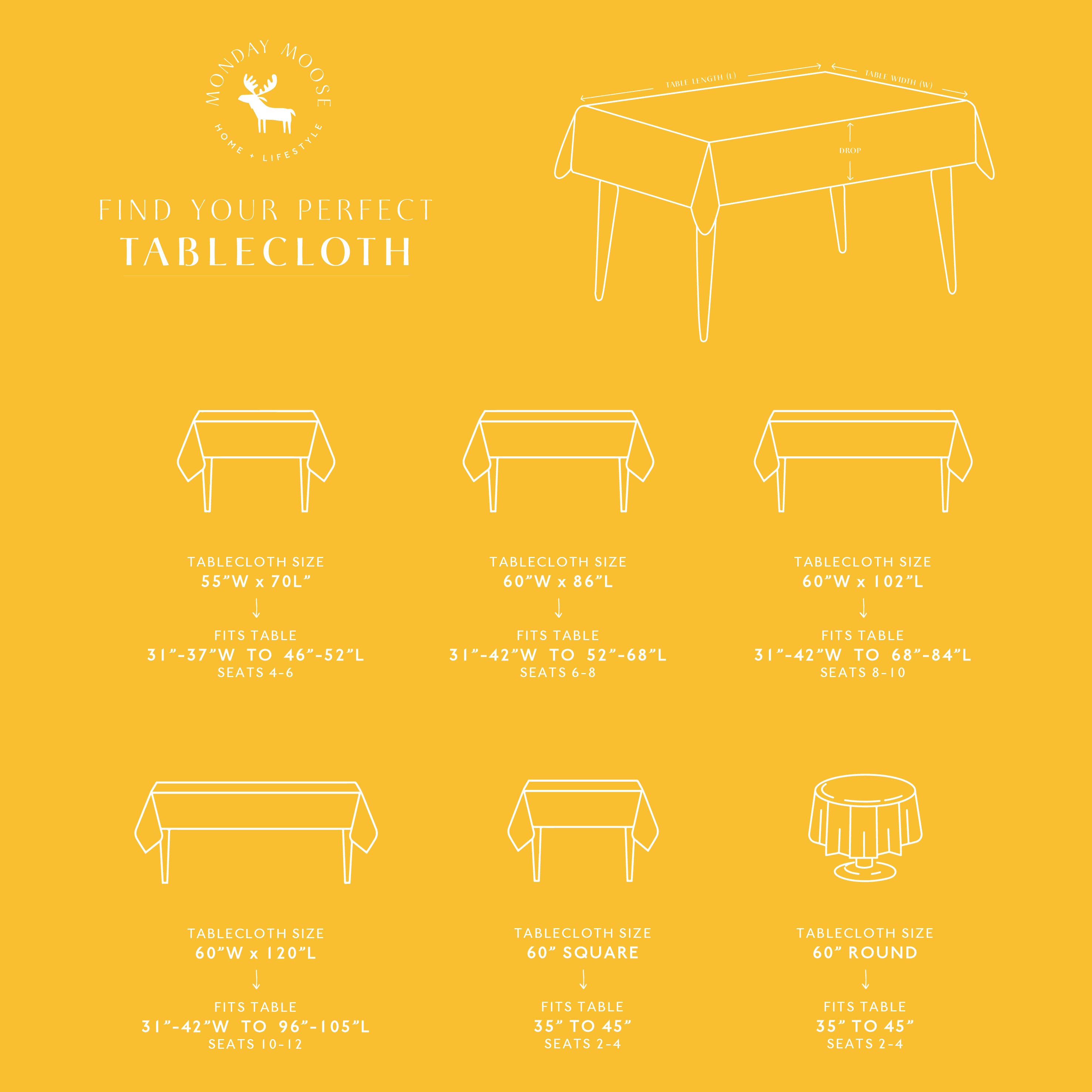 SIZE: 55x70” (4–6 seats), 60x86” (6–8 seats), 60x102” (8–10 seats), 60x120” (10–12 seats), 60” round (2–4 seats), 60” square (2–4 seats). All with 6” border